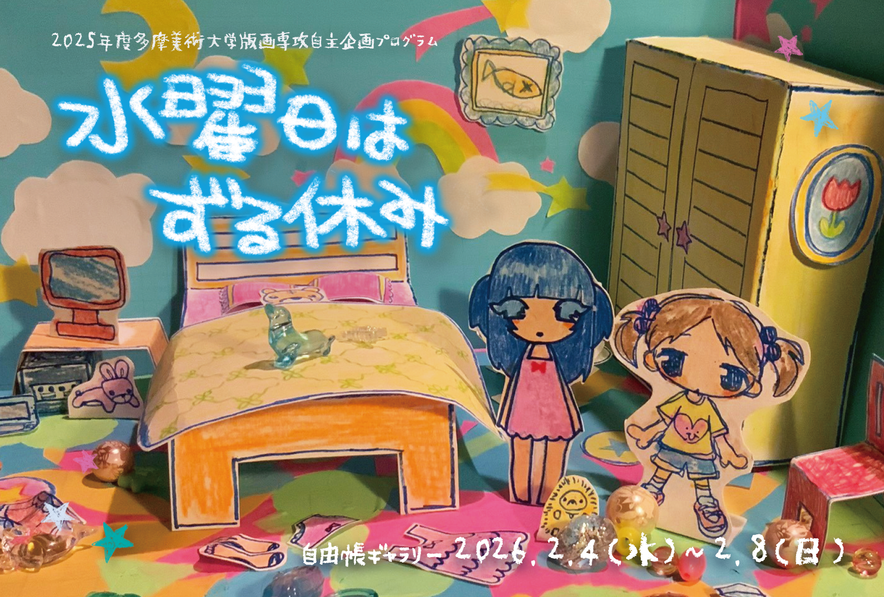 このたび、多摩美術大学絵画学科版画専攻に在籍する 4 年生、よるいっぱいとマルスによる 2 人展『水曜日はずる休み』を開催いたします。